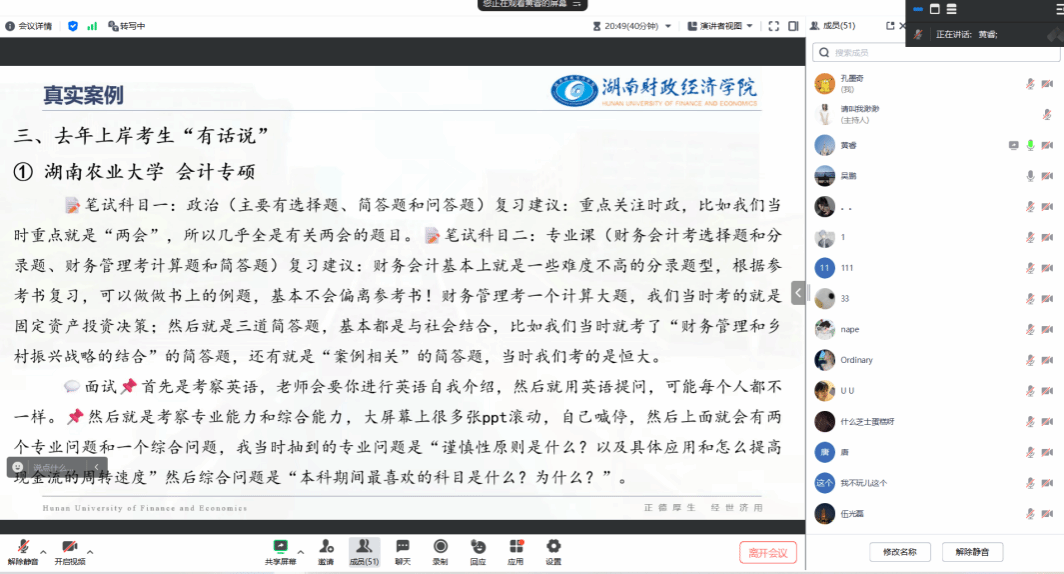 经验分享环节掀起活动高潮,参会人数一度突破60人。广州大学赵金晶同学(best365官网24届审计三班)揭秘"自我介绍埋线法",通过预设学术兴趣点引导考官追问;暨南大学付淑云同学(best365官网24届会计五班)现场演示"知识迁移应答术",以"虽然我不太了解A,但我在B研究中..."的转化话术化解难题;江西财经大学谢景皓同学(best365官网24届ACCA一班)聚焦"数据资产计量""ESG披露"等前沿议题,梳理出多个高频考点;广州外语外贸大学周益明同学(best365官网24届会计二班)更带来独家整理的“考研心灵按摩“,以自身经历生动还原真实考场情境。
