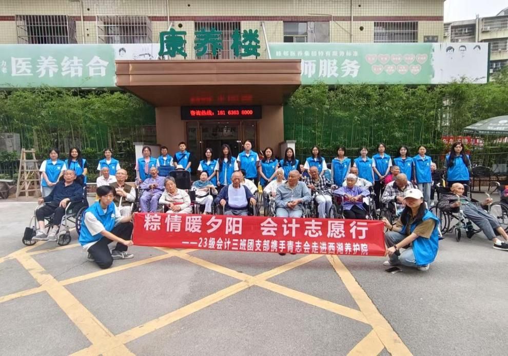 (本网讯)粽叶飘香传情,青春爱心飞扬。5月25日,一场洋溢着温情与关怀的敬老活动在西湖睦邻养老院温馨启幕。院青协携手会计学院23级会计三班团支部走进西湖睦邻养老院,用歌声、手工和舞蹈,为老人们编织了一场充满爱与暖意的时光,让长者们在欢声笑语中感受关怀与陪伴。