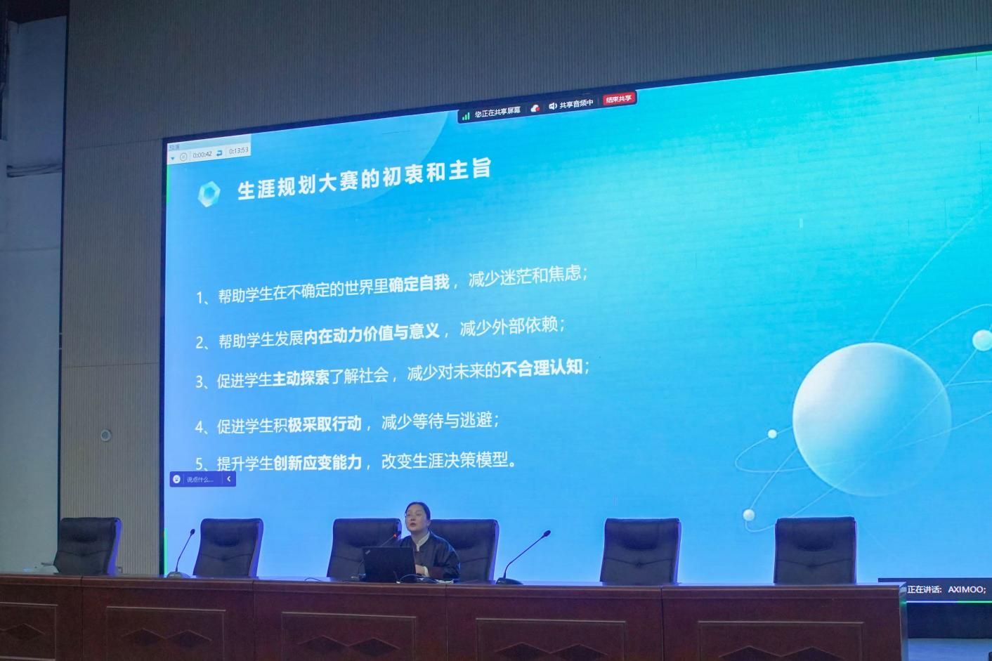 讲座中,吴云就第二届职业生涯规划大赛通知规则方面进行了重点讲述分析。她从赛事的背景理念、参赛材料要求、比赛环节、评审标准等方面进行强调和着重讲解。同时,吴云还通过举出自己学生的例子,生动地说明了生涯发展展示所需的具体内容,给大家提供了规划的思路。