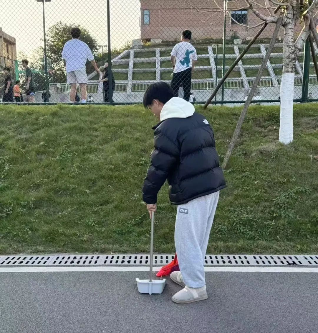校园主干道上,志愿者们挥动手中的扫帚,将落叶与杂物清扫干净,在路边堆积成一座座“小山丘”,接着再忙碌着一来一回将其装入垃圾桶。操场上,志愿者们蹲下身子,用手耐心地捡起隐藏在草坪中的屑物,让草坪重新成为校园里的美丽点缀。