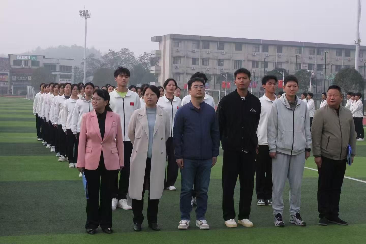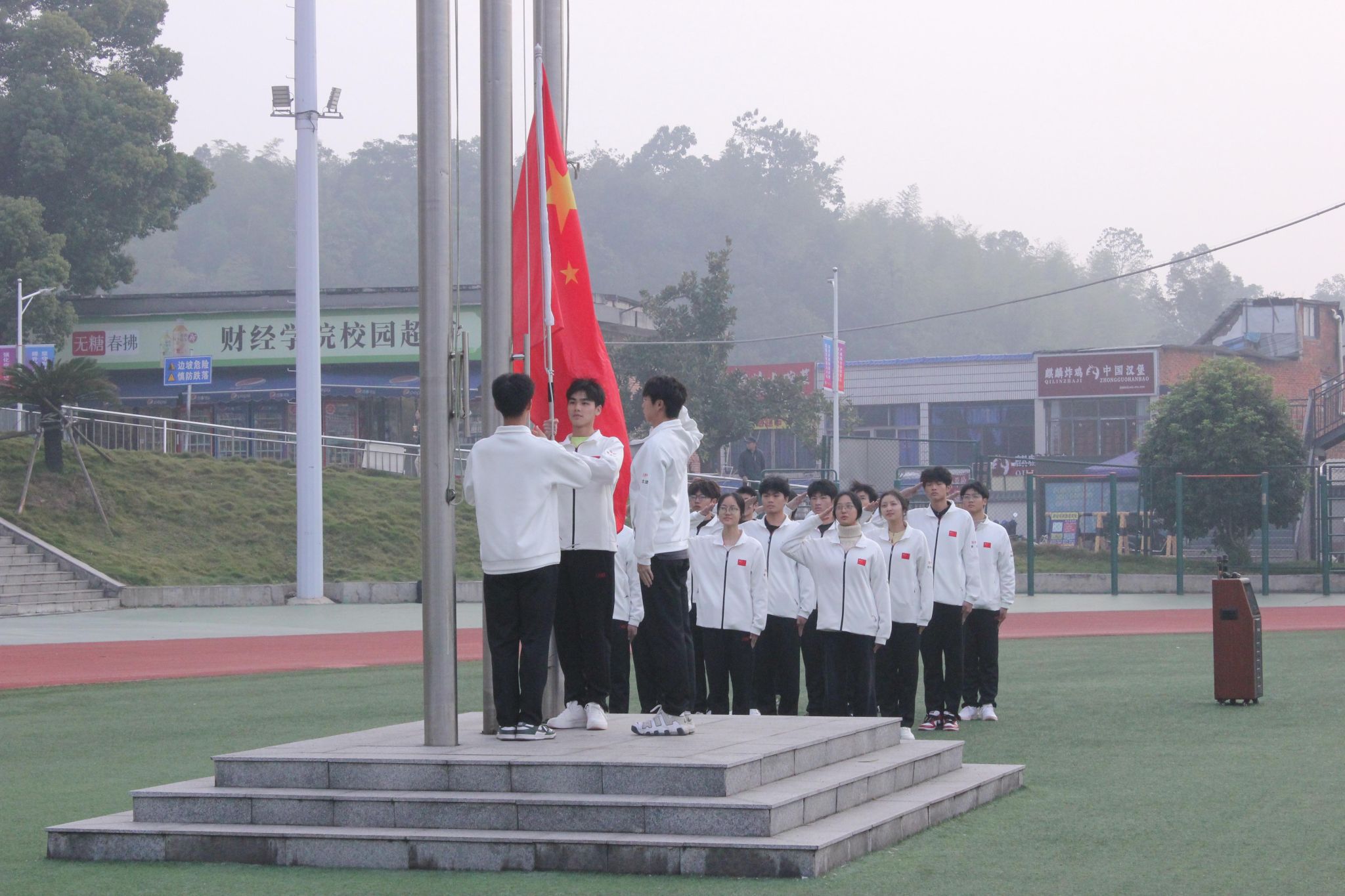 在国旗护卫队整齐的步伐声中,鲜艳的五星红旗入场。随后,国旗升起,全体师生高唱国歌,表达对国旗最崇高的敬意。