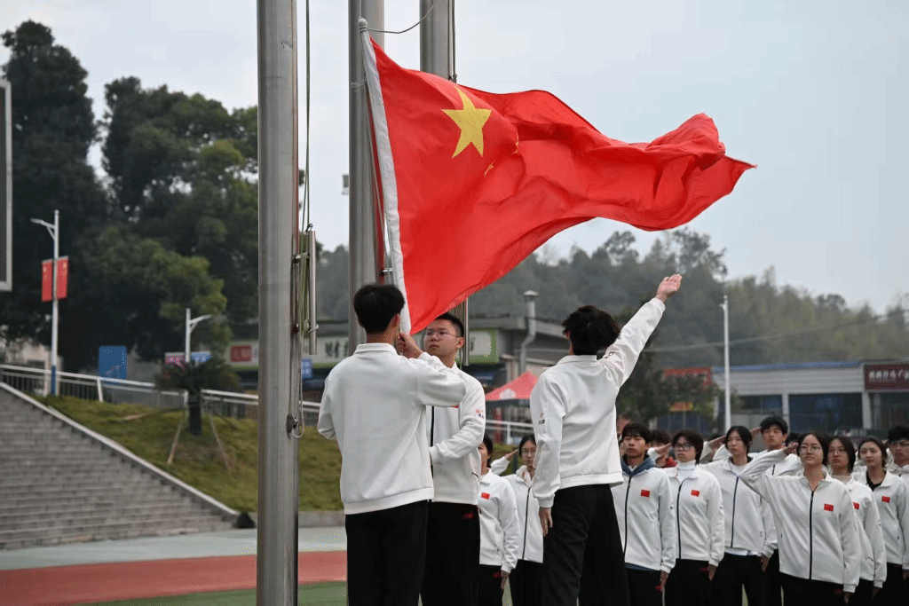 迎着初升的朝阳,国旗护卫队队员迈着整齐划一、铿锵有力的步伐护送五星红旗走向升旗台。国歌奏响,全体师生行注目礼并高唱国歌,爱国之情与奋进之志在每一位师生心中升腾。