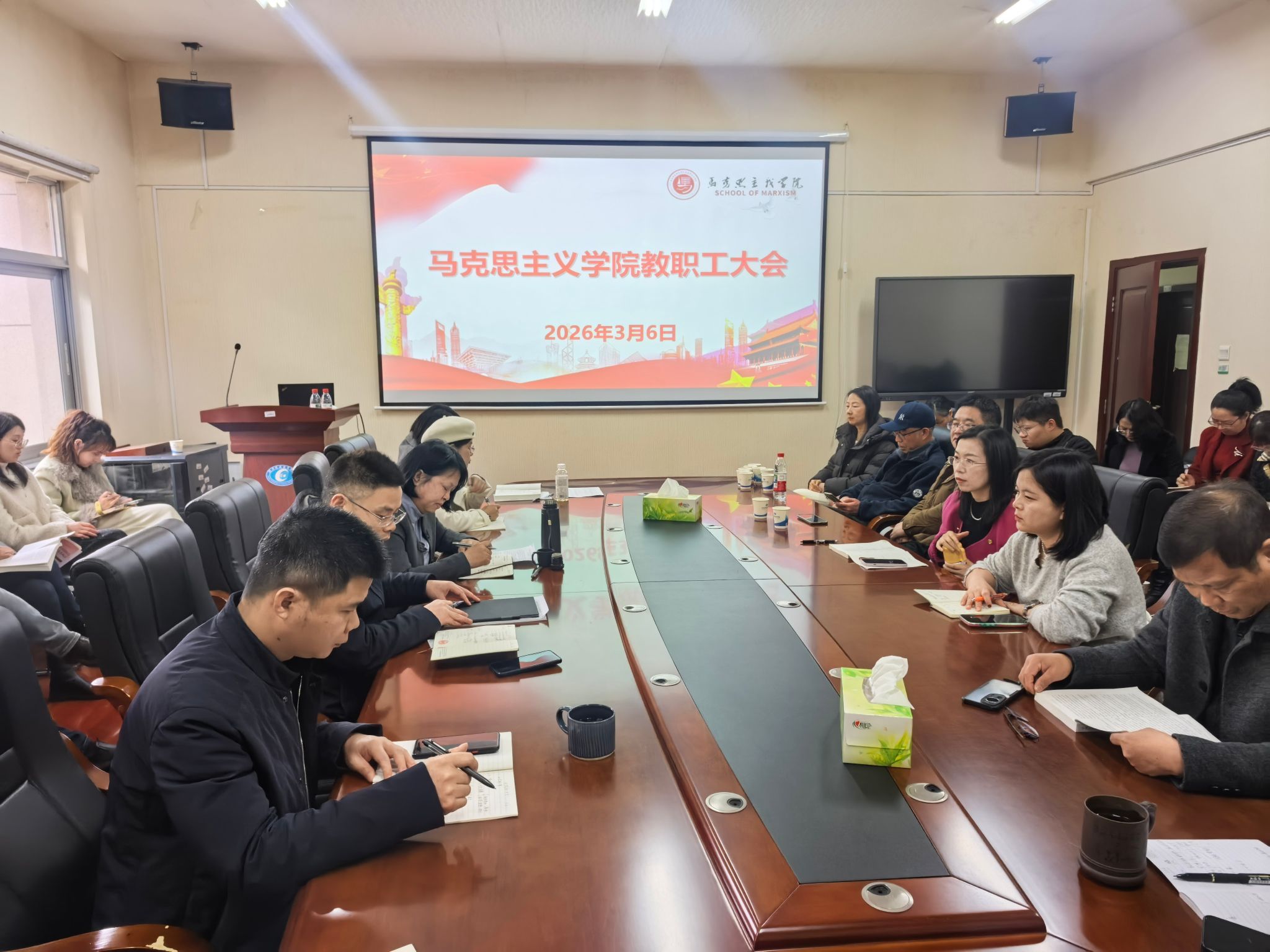 3月6日下午,马克思主义学院在主校区办公楼217会议室召开新学期教职工大会,全体教职工参加。