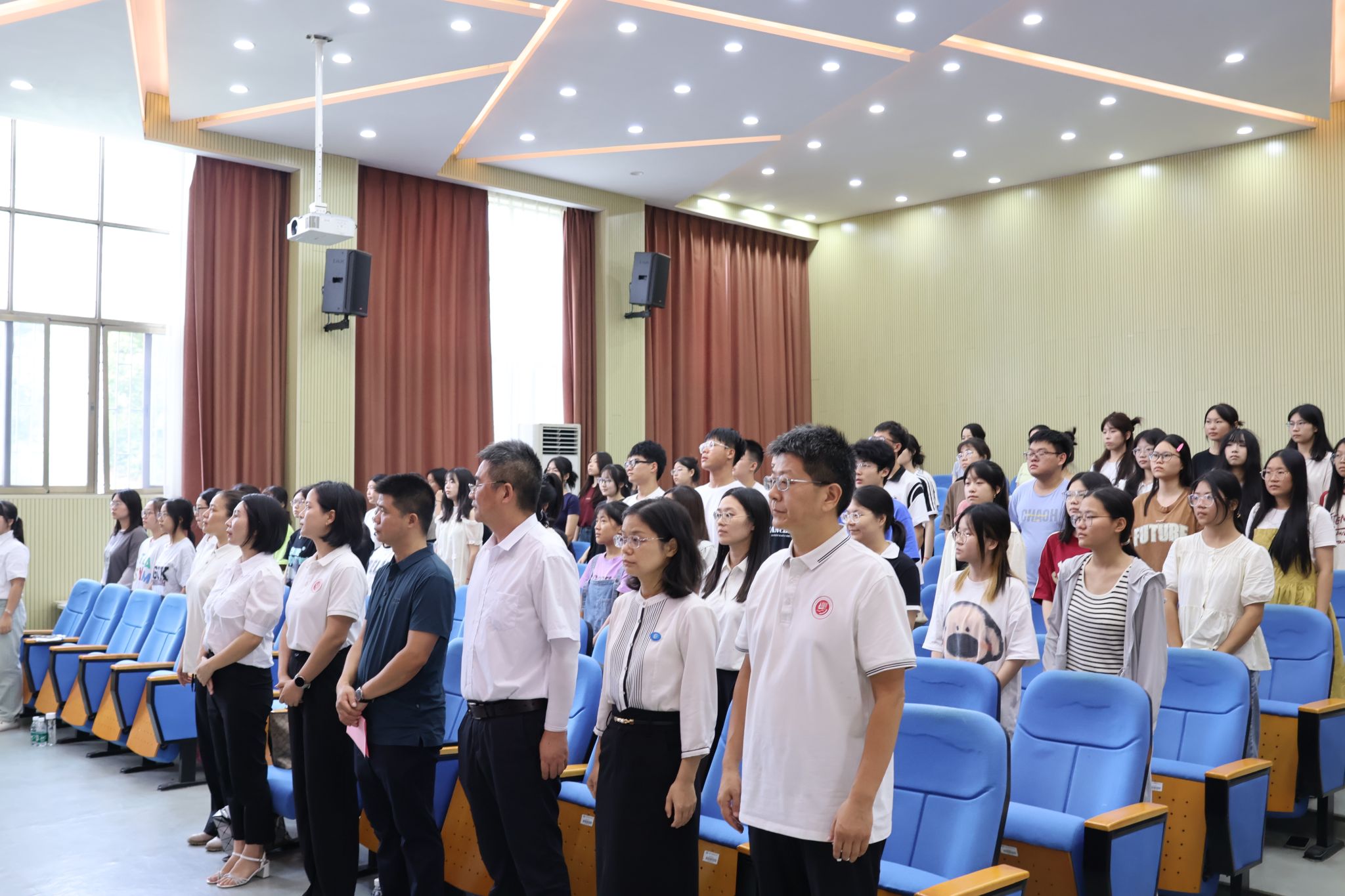 典礼开始,全体起立,奏唱国歌,庄严地开启了本次开学典礼暨新生见面会。