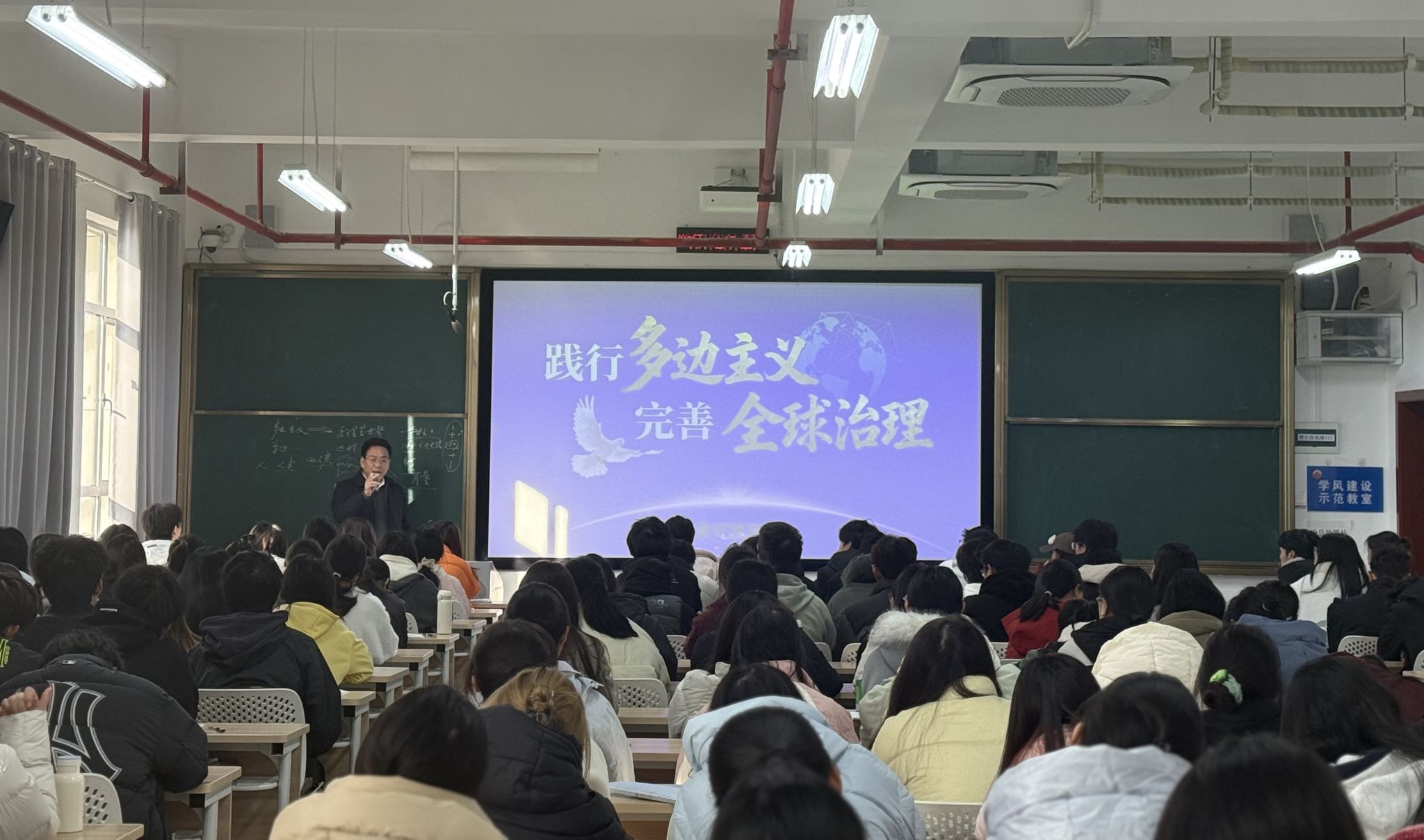 校党委书记易棉阳以“践行多边主义,完善全球治理”为题,从宏观视野深入剖析世界百年未有之大变局与中华民族伟大复兴战略全局的内涵要义、动力机制和未来前景,勉励学生认清时代变革、把握发展机遇,自觉将个人成长融入国家发展大局,刻苦学习、锤炼本领,切实增强使命担当与创新能力。
