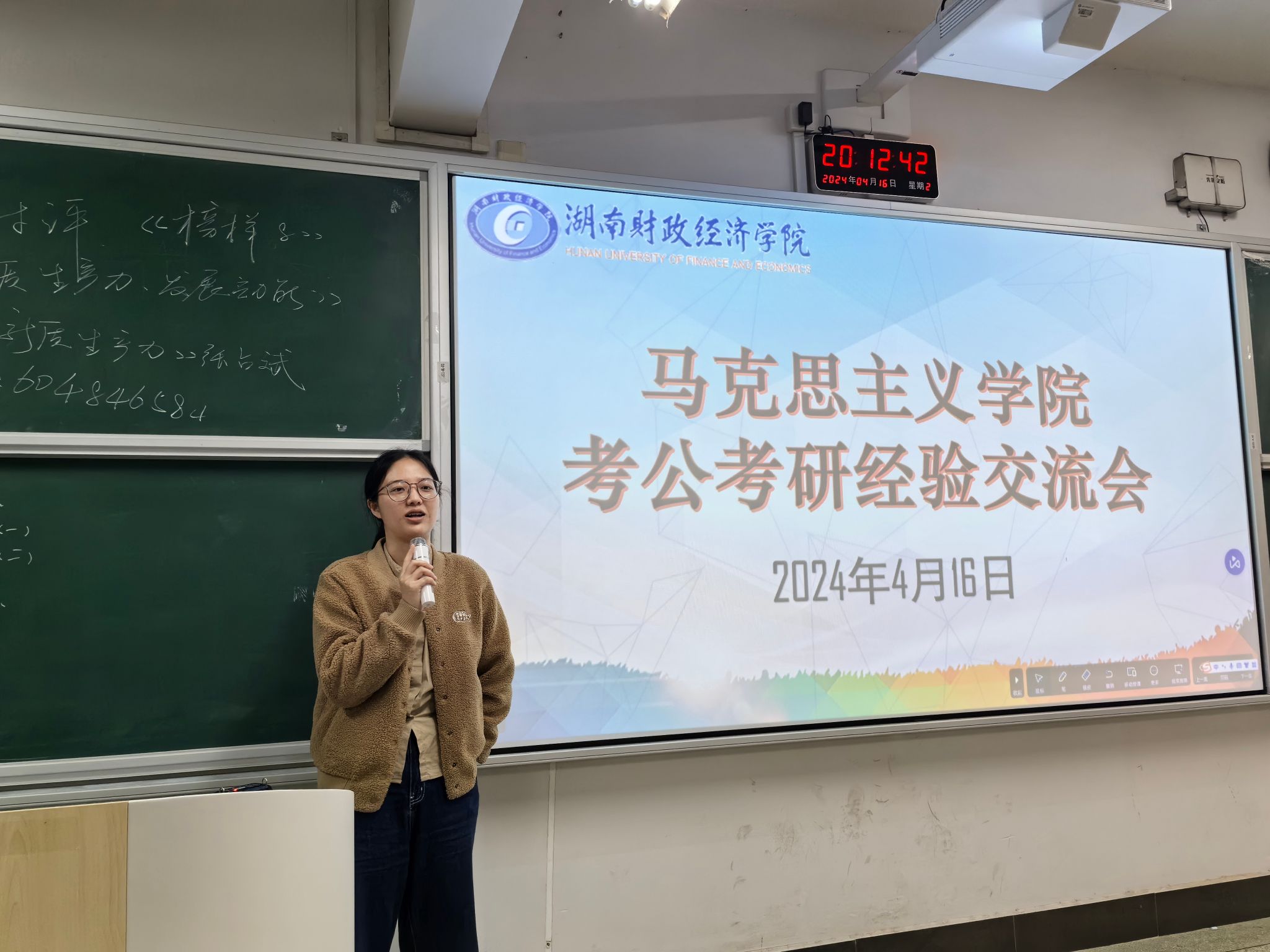 4月16日晚,主校区3110教室座无虚席,马克思主义学院近百名学生在这里聆听了一场别开生面的“考研+考公”经验分享会。5名来自学校不同专业的优秀应届毕业生,结合自身求学经历分享成功考取地方公务员、选调生和顺利通过硕士研究生考试的实战经验。思想政治教育系主任张晓敏分别介绍了5名毕业生的基本情况,鼓励全院学生从优秀毕业生的成功事迹中收获体悟、积蓄力量,理性分析个人专长、客观应对自身不足,始终胸怀梦想、脚踏实地,明确奋斗目标、坚定前进方向,不懈努力书写人生新篇章。