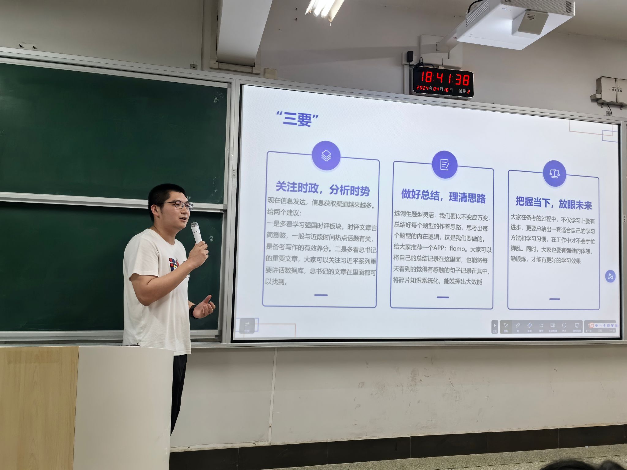 会计学院陈永达,考取郴州市选调生。他从考情分析、备考心得、备考建议、西部计划项目、经验总结等方面,就备考选调生经验进行了分享,提出“三要三防”建议,鼓励大家锚定发展目标并为之努力奋斗,一同追梦、筑梦、圆梦。