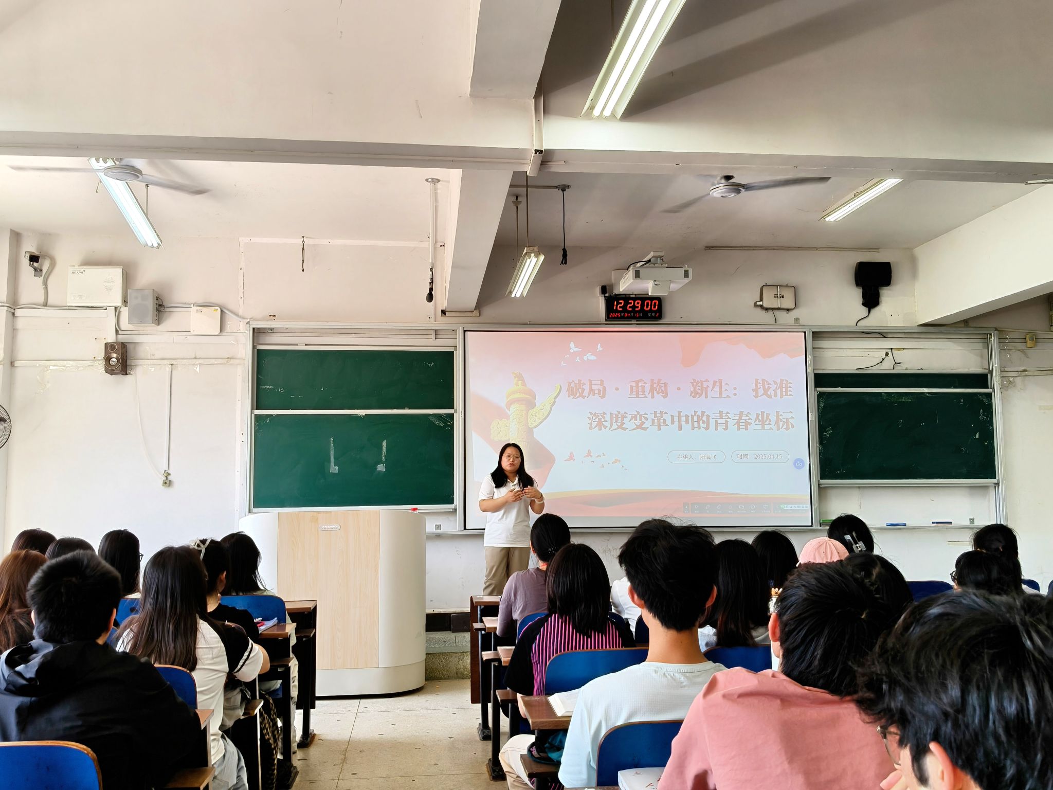 随着开班仪式的落幕,阳海飞开启了思政第一课的讲授。她从百年未有之大变局切入,深刻分析了新时代团员该如何做好新时代发展破局的先行者。同时,阳海飞老师进一步探讨了新时代如何成为社会进步的开拓者、做好引领世界发展的追光者。她激励广大团员和入团积极分子,要立足社会实际,积极投身社会实践,坚定前行信念,树立远大理想、涵养高尚品德、练就过硬本领、胸怀天下,用新时代中国青年特有的方式续写百年青春华章,找准深度变革中的青春坐标,为时代发展、社会进步以及世界引领贡献青春力量。