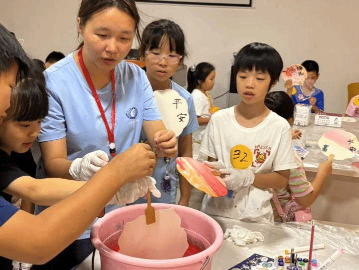 活动现场,一滴朱砂入清水,瞬间晕开如晚霞;一点石绿轻搅,便似春水映苔痕。孩子们屏住呼吸,看着空白扇面轻触水面,一提一沉间,斑斓色彩便在扇面绽放。“我要加金色!”“我想画个太阳!” 孩子们的奇思妙想,让传统漆艺焕发童真光彩。当第一把自制漆扇晾干,10 岁的小雨举着它跑向老师,古扇的雅致与孩童的活泼在此刻完美交融。