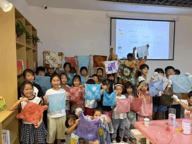 课堂的另一幕,成了蓝白交织的艺术天地。志愿者们以生动的故事开篇,为孩子们铺开扎染的千年画卷:从秦汉时期的“缬”工艺,到明清时期的民间普及,这项以针缝线扎控制染色的技艺,每一道纹理都藏着古人的生活智慧。