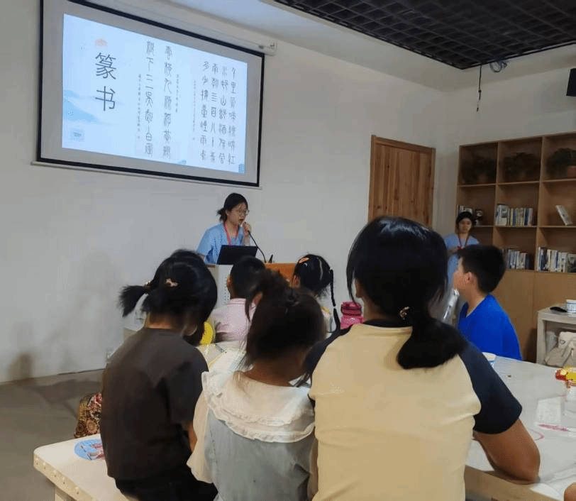 活动伊始,志愿者小蒋老师借助精心制作的 PPT,为孩子们开启了一场书法文化之旅。她生动讲解了篆书的古朴庄重、隶书的典雅舒展、楷书的工整严谨、行书的流畅灵动以及草书的奔放洒脱,让孩子们在视觉与听觉的双重体验中,初步领略中国古代五大书体的独特魅力。“老师,这个字好像画画呀!”“这个字写得好快呀!” 孩子们指着屏幕上的书法作品,叽叽喳喳地讨论着,原本对书法知之甚少的他们,瞬间被古老文字的魅力深深吸引。