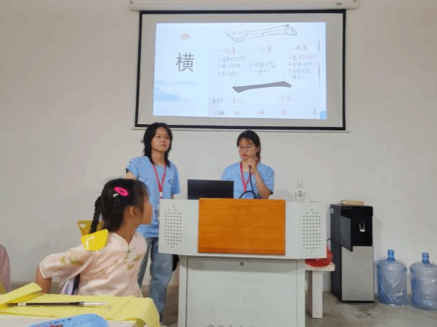 在基础知识讲解环节后,小蒋老师重点示范了握笔姿势和 “横” 画的起笔、行笔、收笔技巧。“握笔要指实掌虚,就像手里握着一个小鸡蛋。” 她一边讲解,一边拿起毛笔现场演示,孩子们聚精会神地看着,不时跟着模仿。志愿者们则在教室来回走动,及时纠正孩子们的错误后,鼓励孩子们自己动手,他们用稚嫩的小手生涩的拿着毛笔,蘸上墨“颤颤巍巍”的开始了他们的“创作”,当孩子们不经意间被墨汁偷袭时,他们调皮地对着同伴做个鬼脸,又埋头沉浸在笔墨世界里,教室里的墨香混着孩子们的笑声,酿成了最清甜的夏日滋味。