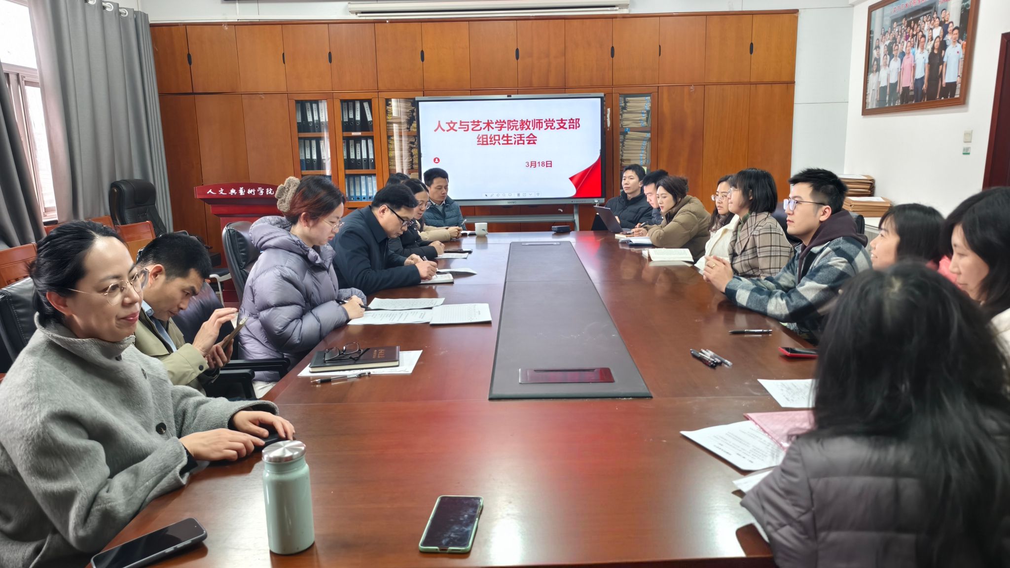 (本网讯)2026年3月18日,人文与艺术学院教师党支部2025年度组织生活会暨民主评议党员会议在行政楼817办公室召开。学院党委书记葛干忠出席会议并讲授专题党课、作点评讲话,教师党支部书记陈洁主持会议,支部全体教师党员参会,会议严格按照既定议程有序推进,全程氛围严肃务实、凝心聚力。