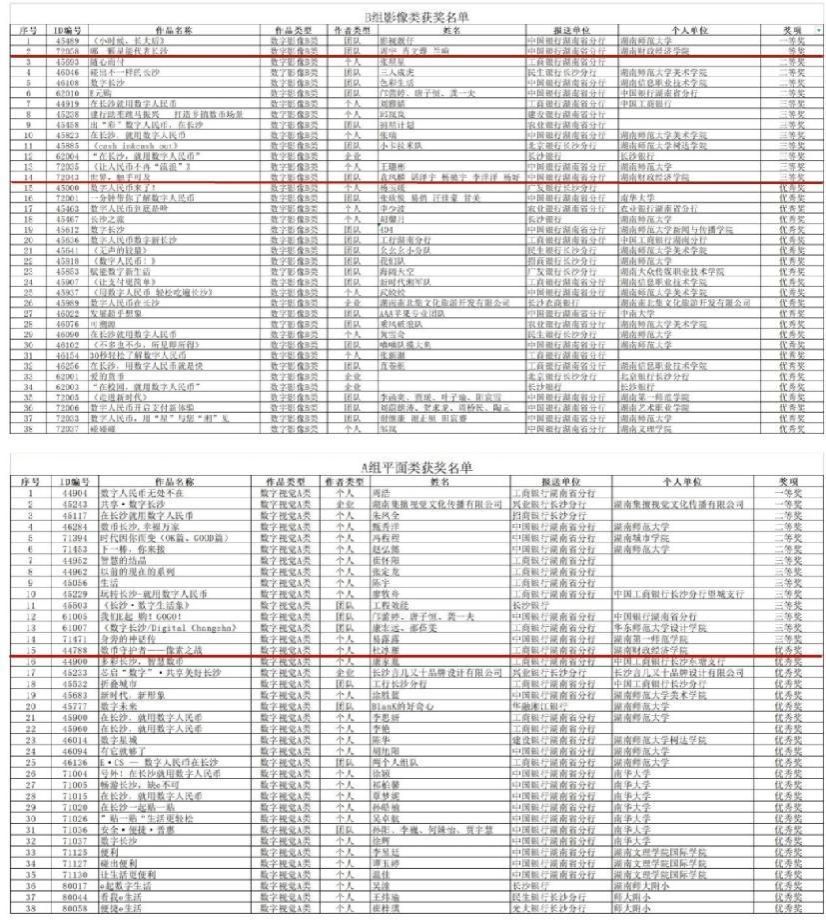 荣获全国大学生广告艺术大赛国奖省奖40余项;获得湖南省大学生公益广告大赛省级奖项多项;获得大学生艺术展演湖南省一等奖;获得湖南省青年文化艺术节省级金奖;获得中国大学生广告艺术节学院奖国家级奖项8项;获得湖南微电影大赛省级奖项14项;获得湖南省高校“青春学习堂”短视频大赛特等奖等省级奖项11项,成功实现大满贯!
