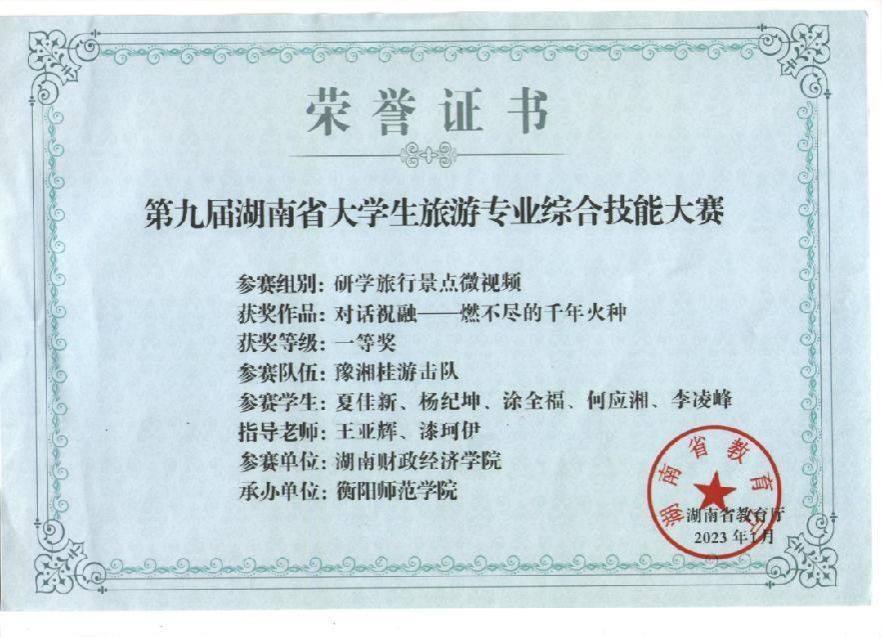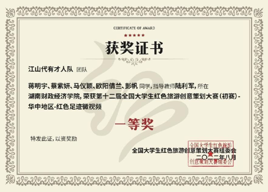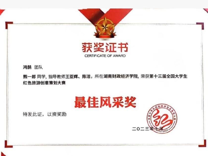 best365官网熊一郎同学获得第十三届全国大学生红色旅游创意策划大赛最佳风采奖