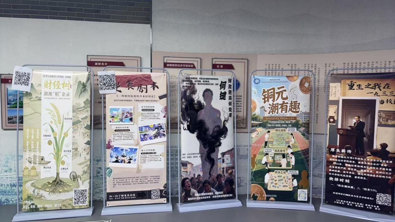 此次创意海报湘遇财经,智汇未来——开启财经素养的探索之旅”为主题,旨在“启财经智慧,溯校史根脉,筑未来财商”。海报创意展由三大模块构成“钱的时空之旅”、“厚生风华校史”、“湖南财经文化同学们运用《大型活动策划与管理》课程相关知识集思广益,深入挖掘校史文化与财经脉络,遵循“有意思”与“有意义”的双重目标,基于“形意动”逻辑设计创意海报,撰写内容推文,配套趣味活动——立体化呈现财经校史解码成果
