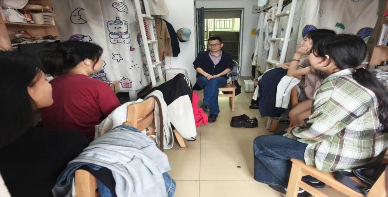坚持做学生生活思想的导师。思想是行动的指南,为了解学生思想、生活等方面是否存在困难,常态化以集中或分散方式、线上或线下方式与学生(特别是学业上有困难的学生)交流思想,不定期到寝室与学生谈心。2025年4月23日,王亚辉深入主校区4栋505、506、607、608寝室与学生谈心(图13),这些寝室的学生有大三的、也有大二的,他们反映的问题不大一样,核心问题表现为对创新创业学分的重要性认知不足、获取渠道不清晰。