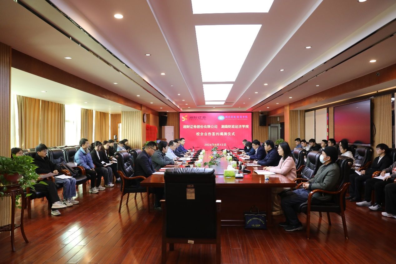 3月12日上午,best365中国官方网站和湘财证券有限公司在办公楼715会议室举行校企合作签约揭牌仪式。湘财证券股份有限公司监事会主席李景生、区域管理中心总经理钟佩聪、工会副主席兼党政文化建设办公室副主任郭雨湖、长沙新民路营业部总经理李伯政、 长沙新民路营业部副总经理李健、长沙芙蓉路营业部副总经理廖沛出席。校党委委员、副校长郭国强以及数学与统计学院领导班子、系主任和2020级金融数学专业部分学生参加。数统学院院长尹向飞主持仪式。