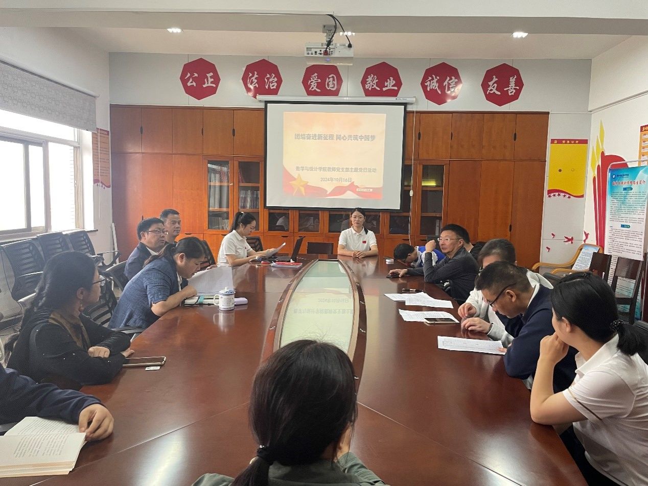 20241016日下午,数学与统计学院教师党支部于办公楼809会议室开展“团结奋进新征程,同心共筑中国梦”主题党日活动。活动以微党课和看片学习的方式进行,由学院教师党支部书记丁德琼主持。