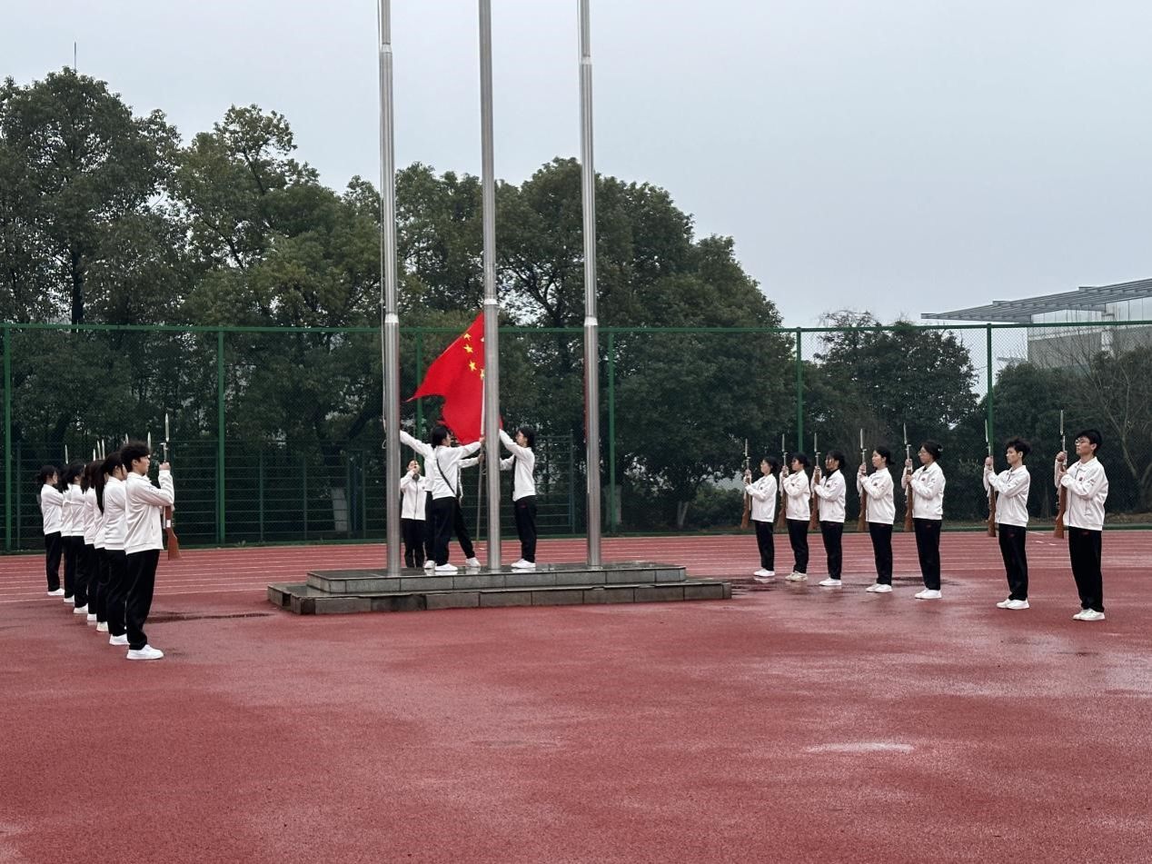 清晨7时,升旗仪式正式拉开帷幕。国旗护卫队队员身姿挺拔、步伐铿锵,迈着整齐的步伐护送五星红旗走向升旗台。雄壮的国歌声奏响,鲜艳的五星红旗迎着晨光冉冉升起,全体师生肃立致敬、行注目礼,目光追随着飘扬的国旗,心中满是对祖国的崇高敬意与深切热爱。