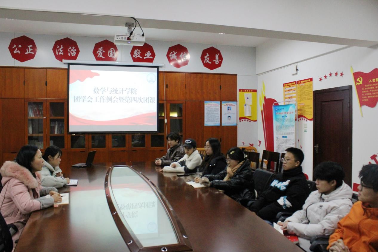 为切实推进团总支、学生会工作的建设与发展,数学与统计学院于12月15日下午在办公楼809召开了团总支、学生会工作专题会议及第四次团课。学院党总支副书记杨艳、团总支书记吴雅芳、团学会主席团成员及各部门部长参与了本次会议。