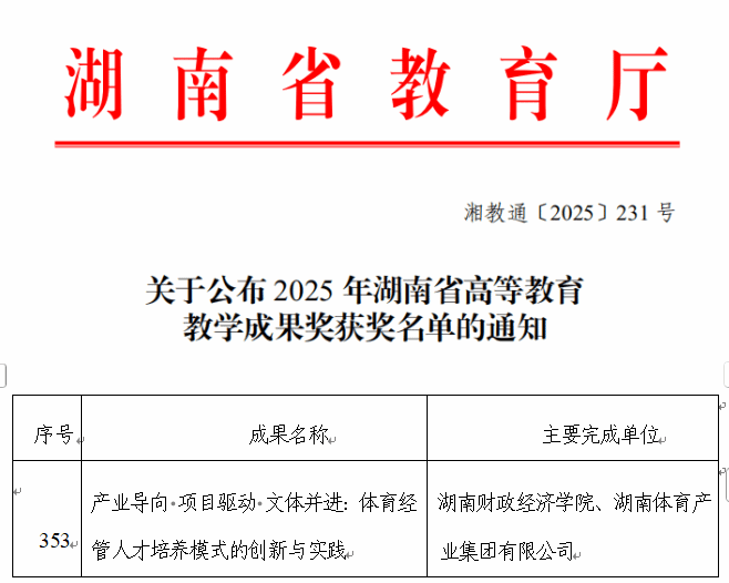 近日,湖南省教育厅公布2025年湖南省高等教育教学成果奖获奖名单,我院的教学成果《产业导向 项目驱动 文体并进:体育经管人才培养模式的创新与实践》获二等奖,这是我院在人才培养改革领域取得的新的突破,也是在该教学成果奖上的一次突破。