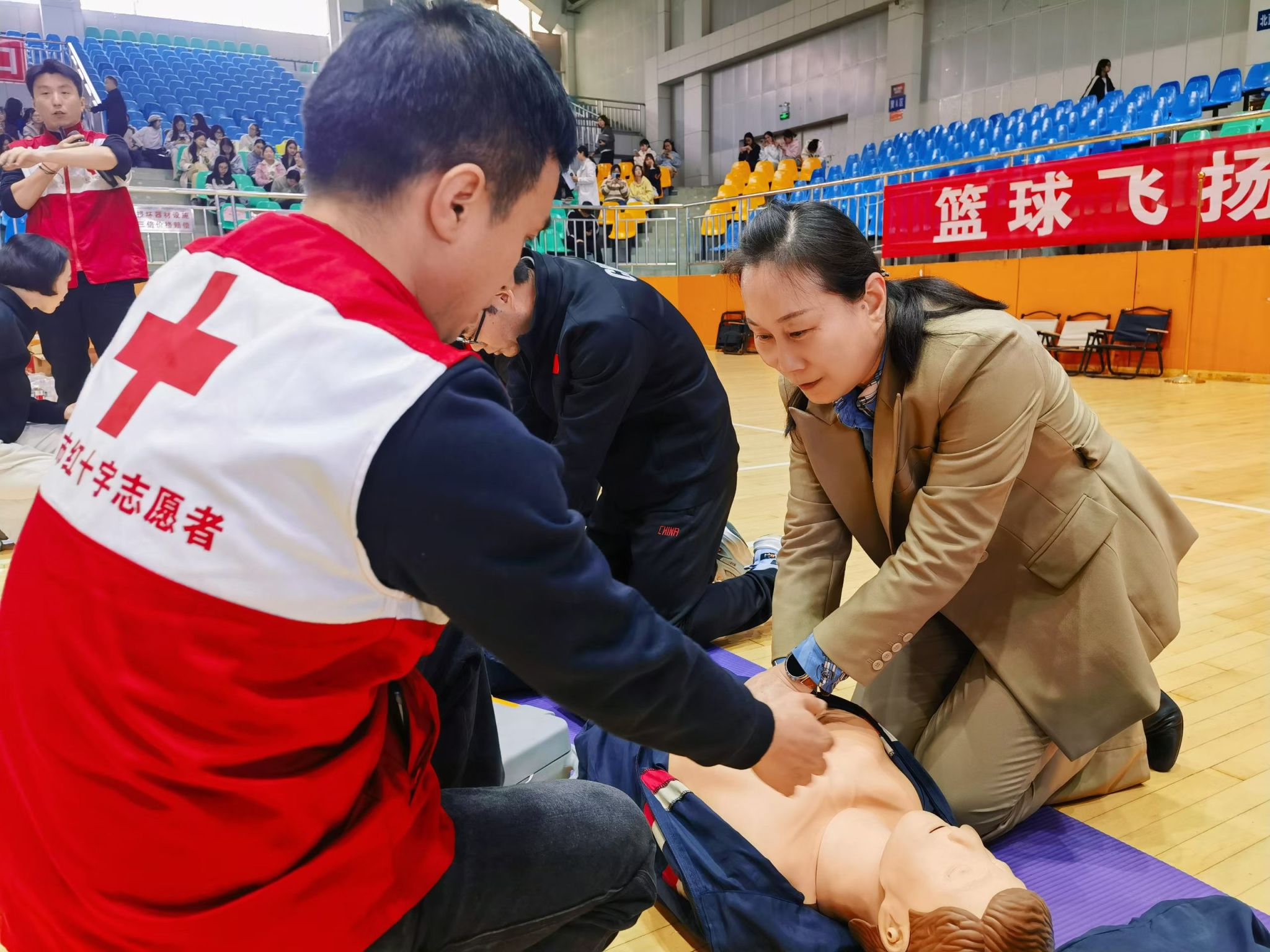 培训现场,红十字会专家围绕红十字基础知识、运动损伤应急处置、心肺复苏规范操作、AED除颤仪使用、气道异物梗阻急救等内容进行系统讲解。授课专家结合真实案例,深入浅出讲解心搏骤停识别、“黄金4分钟”急救原则、徒手心肺复苏流程、AED操作要点及海姆立克急救法等关键技能,通过示范教学、要点拆解、互动答疑,让参训师生全面掌握急救知识与操作要领。