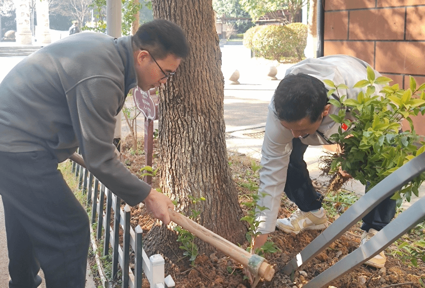 各位党员志愿者带上工具,在小区绿化带开展植树活动。大家两人一组、分工协作,搬苗、种树、培土,各个环节都有条不紊,每个步骤都细致认真,力求让每棵树苗都能茁壮成长,经过近两个小时的努力, 种下了一株株绿色新苗。