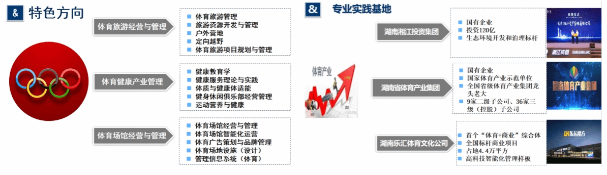 本专业秉持“体育+经济+管理”的学科交叉办学特色,以培养“懂经管的体育人、懂体育的经管人”为目标,对接市场需求,以体育旅游经营与管理、体育健康产业管理、体育场馆经营与管理为主方向,在传授基础理论知识的同时,也注重专业实践技能训练,培养立足于服务湖南,辐射中南及西南地区的综合型高素质人才,努力将体育经济与管理专业打造成“国内知名、省内领先、特色鲜明”的应用型本科专业。