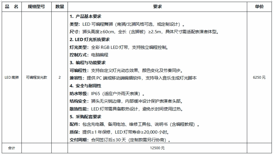 2.采购项目的特定资格条件:南狮须是Led可编程狮子。