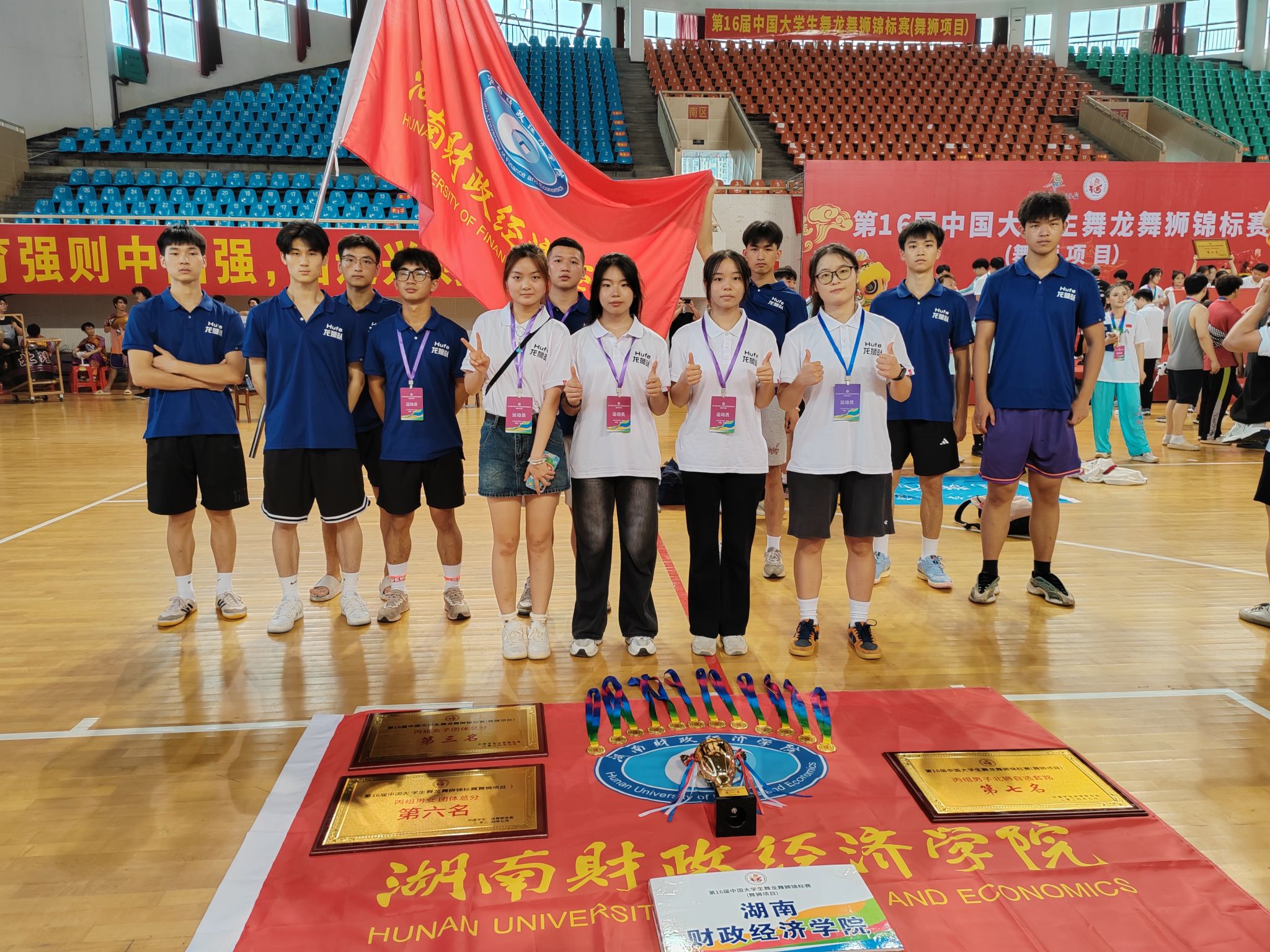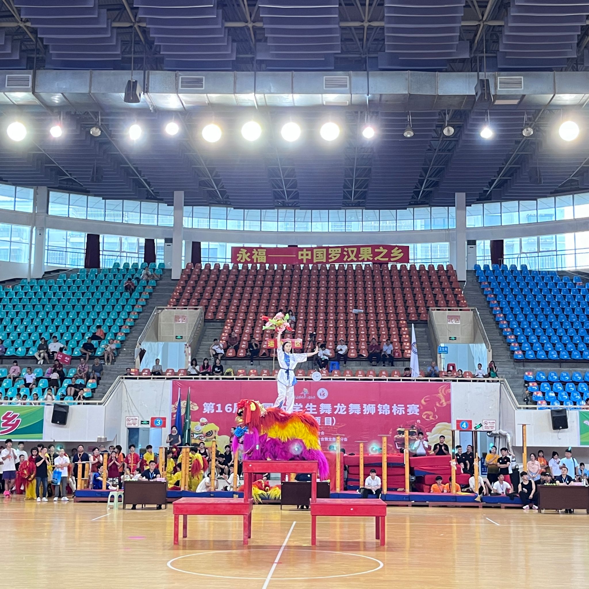 (本网讯)2024年7月29日,为期三天的第16届中国大学生舞龙舞狮锦标赛在广西永福县体育馆圆满收官。本次比赛由中国学生体育联合会主办、桂林市永福县人民政府承办,吸引了来自全国各地的44所高等院校的舞狮队共计600余名运动员参赛。best365官网舞龙舞狮队经过五个月的艰苦备战训练,组织女子运动员5名,男子运动员10名参加此次比赛。