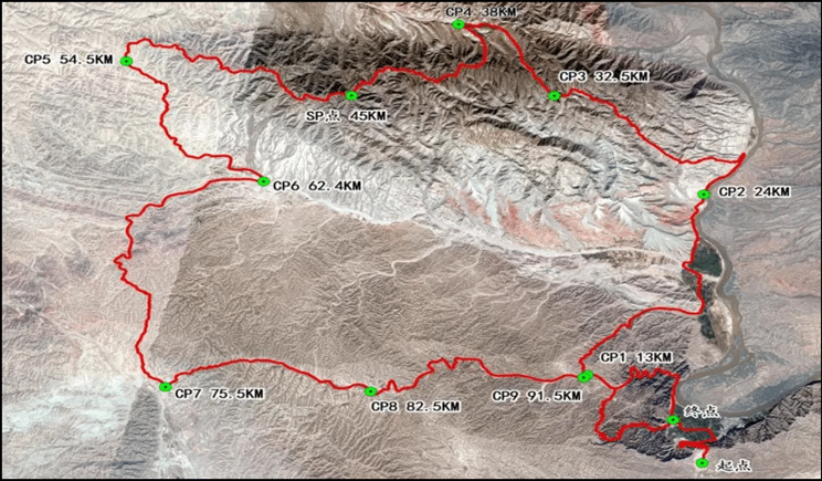 2021年百公里越野赛线路为:黄河石林景区门口(起点)—豹子沟广场—观景台—常生村—朱家窑—付家岘—金坪村—戚家泉—豹子沟广场(终点),全程96.07公里,共设置9个打卡点(CP点,除3号打卡点外,其他各打卡点均设有补给点)1个转运点(6号打卡点)1个补给点(SP)