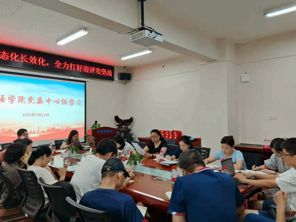 (本网讯)7月10日下午,外国语学院在办公楼315会议室召开7月党委理论学习中心组集中学习会议。学院党委书记凌飞主持会议,班子成员、党委委员、党支部书记及各办公室、系部负责人参加会议。