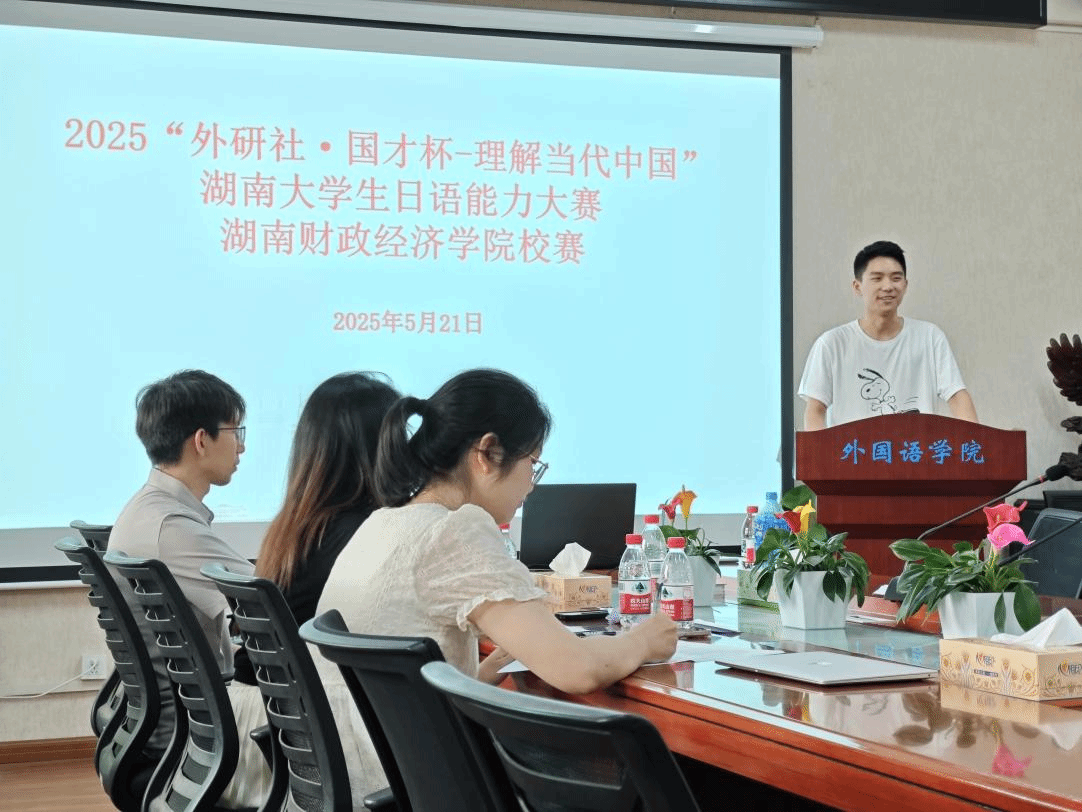 (本网讯)为积极响应关于加强文化传播与国际交流的号召,全方位提升日语专业学生的综合素养,5月21日下午,外国语学院在主校区办公楼315会议室举办 “外研社·国才杯”“理解当代中国”湖南省大学生日语能力大赛校赛。本次比赛分为笔试和即兴演讲两个部分,由何雨瑾、秦瑶、刘品原三位老师担任评委。比赛旨在考查学生的日语综合运用能力,不仅吸引了众多日语专业的学生,有日语基础、对日语有浓厚兴趣的非专业学生也踊跃参与。