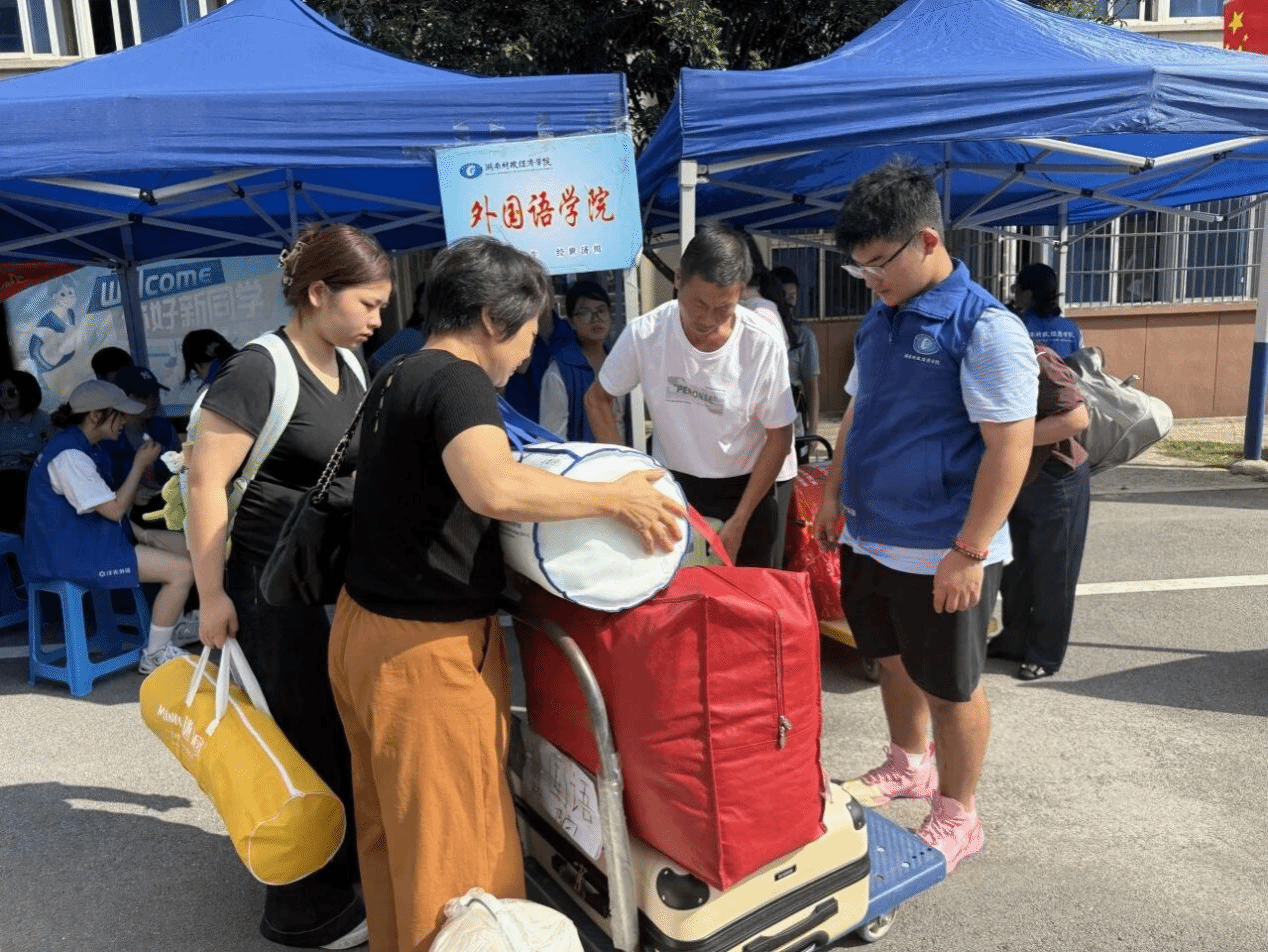 (本网讯)为迎接外国语学院2025级新生,确保报到工作有序、温馨,在学院党委的提前谋划、细致部署下,9月11日,迎新工作温暖启幕,院党委书记凌飞、党委副书记张鹏亲临现场指导,2025级新生辅导员马小红全程陪伴,团总支书记代承轩带领志愿服务队精心筹备。多方联动、全员参与,以饱满的热情和周到的服务,为新生打造温馨、便捷、充满关怀的入学体验。