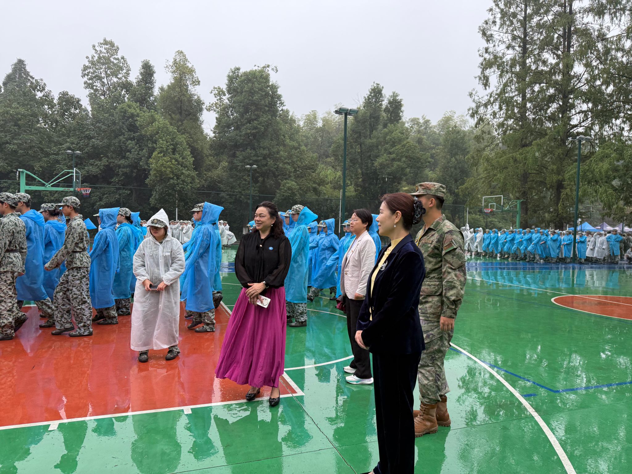 凌飞对同学们在恶劣天气下依然坚持训练、服从指挥的顽强作风给予高度赞扬。她表示,军训是大学生涯的第一课,在锻炼体魄的同时更是对大家意志的磨砺,希望同学们在风雨中锤炼品格,在坚持中收获成长,以军人的标准严格要求自己,为今后的学习生活打下坚实基础。书记还向不畏辛劳、恪尽职守的带训教官致以诚挚谢意,感谢他们科学施训、严格管理。对始终坚守一线、全程陪伴的辅导员马老师表示充分肯定,叮嘱大家密切关注学生身体与心理状态,做好防寒保暖和安全防护工作,确保军训安全平稳进行。