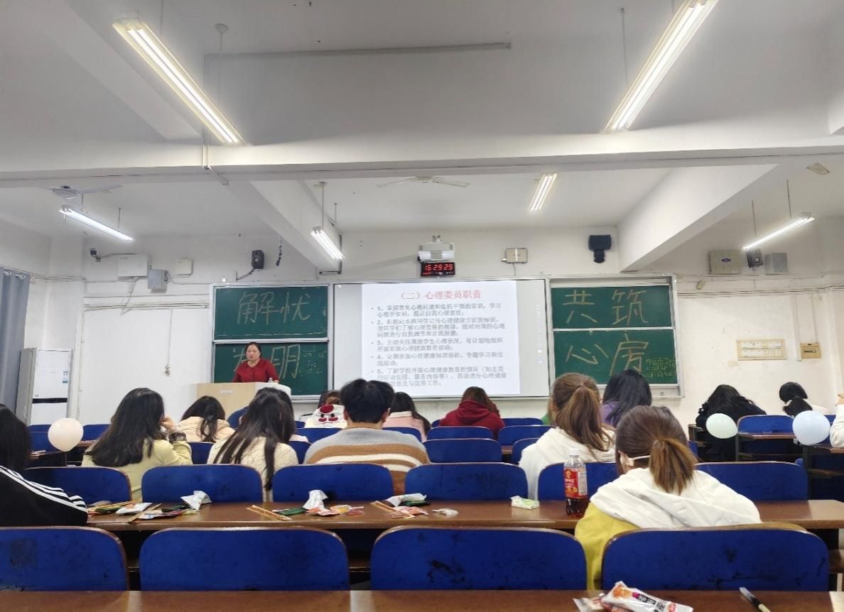 (本网讯)为深入推进大学生心理健康教育工作,营造积极向上、互助友爱的学院学习氛围,外国语学院心理部于11月12日下午2:30在第三教学楼3207教室举办了“解忧有朋,共筑心房”为主题的心理朋辈辅导系列活动,本次活动由外国语学院学工办主办,学院心理部承办,旨在充分发挥朋辈辅导的独特优势,将外语学科特色与心理健康教育深度融合,为同学们搭建一个倾诉、交流与成长的温暖平台。培训由谭霞老师主讲,李小金同学主持,外国语学院各班心理委员以及班长,团支书,心健部各成员参加。