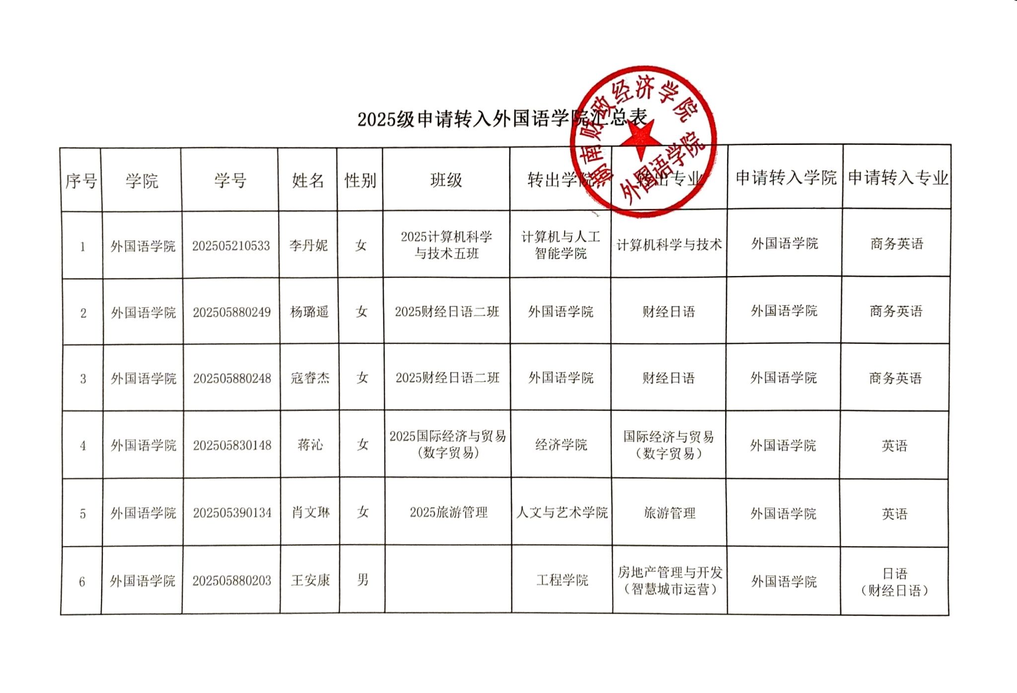 附件:2025级申请转入外国语学院拟录取学生名单汇总表