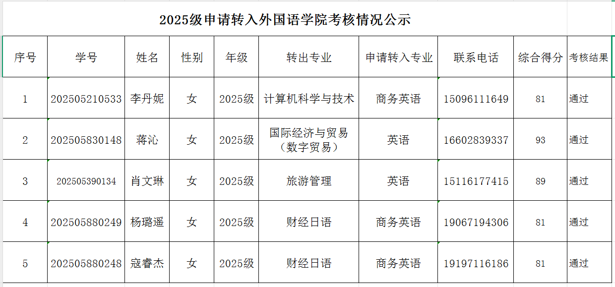 2025级学生申请转入外国语学院考核情况公示