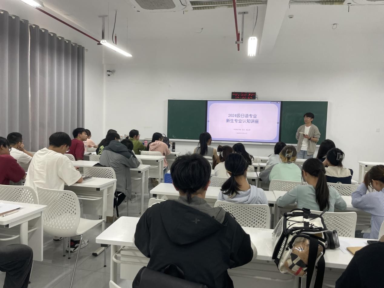 (本网讯)为帮助2024级日语系新生更快适应大学生活,了解本专业的学习方法和目标,明确学习目标并做好职业生涯规划,11月13日下午,外国语学院日语系在雷锋学院L1104举办了专业认知讲座。本次讲座由日语系主任孔征、青年教师刘品原主讲,2024级日语系全体新生聆听了讲座。