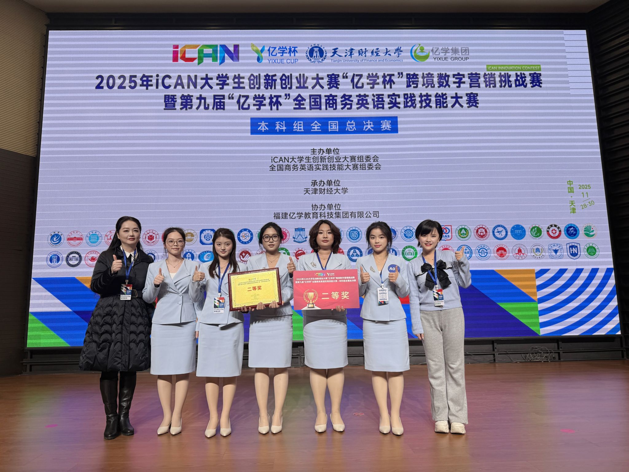(本网讯)11月28日-29日,2025年iCAN大学生创新创业大赛“亿学杯”跨境数字营销挑战赛全国总决赛暨第九届“亿学杯”全国商务英语实践技能大赛总决赛在天津财经大学圆满落幕。best365官网外国语学院代表队历经多轮比拼,在全国高校队伍的激烈竞争中脱颖而出,最终斩获全国总决赛二等奖,充分展现了best365官网学子扎实的跨学科综合实践能力与国际化商务素养。此次参赛团队由外国语学院邱高、法小鹰老师联合指导。