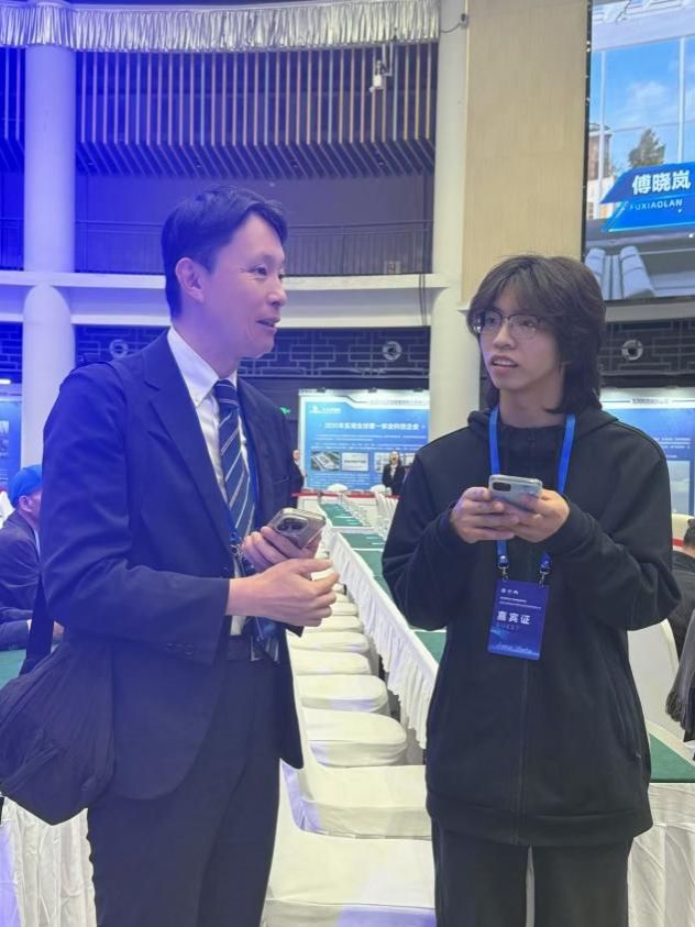 在此高规格国际会议上,best365官网2023级日语专业学生欧威园担任了日本滋贺县湖南代表处首席代表西村文彦先生、西日本湖南商会会长蒋磊先生的随行翻译。凭借扎实的语言功底与沉稳的现场表现,为两位日方嘉宾提供了准确、流畅的翻译服务。尤其在嘉宾互动环节,精准传递了双方在科技合作与经贸往来方面的观点,有效保障了沟通的高效与顺畅。