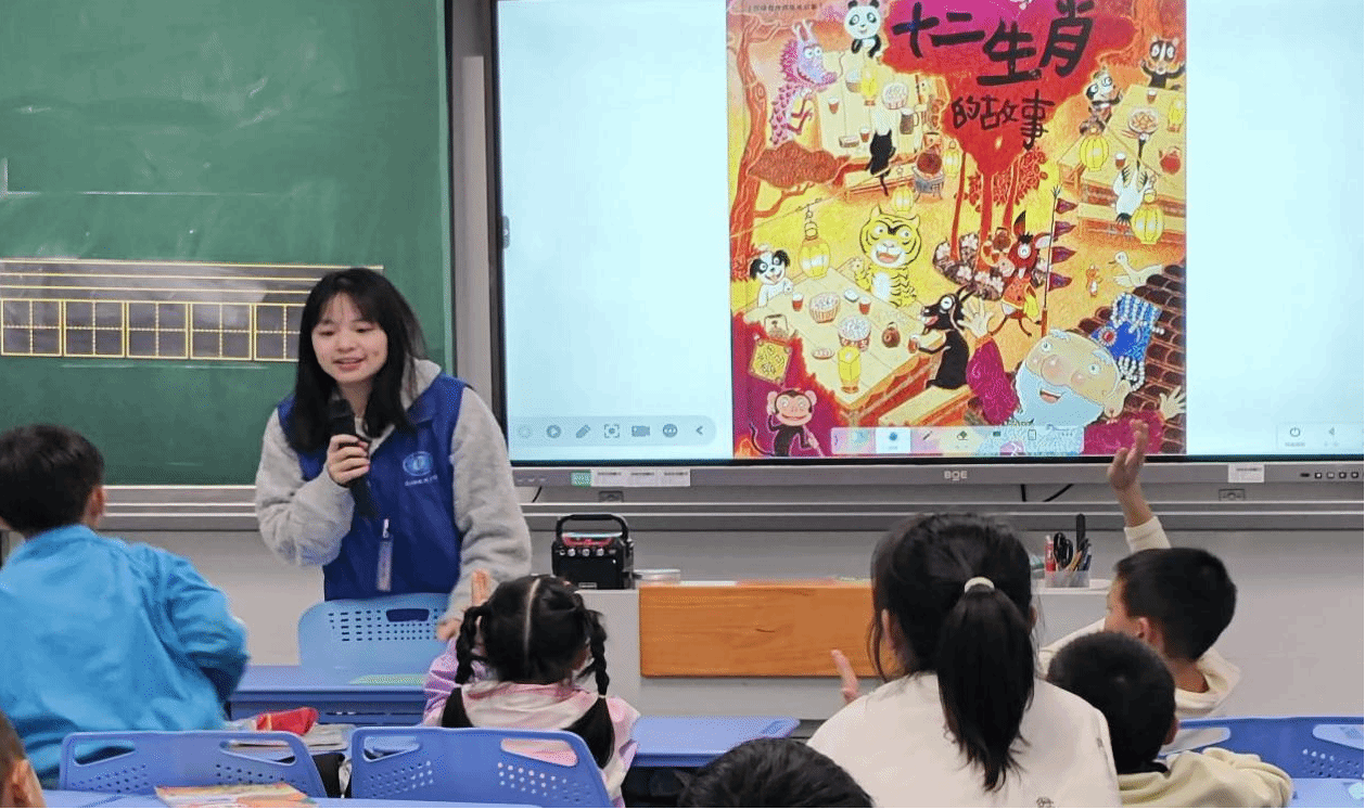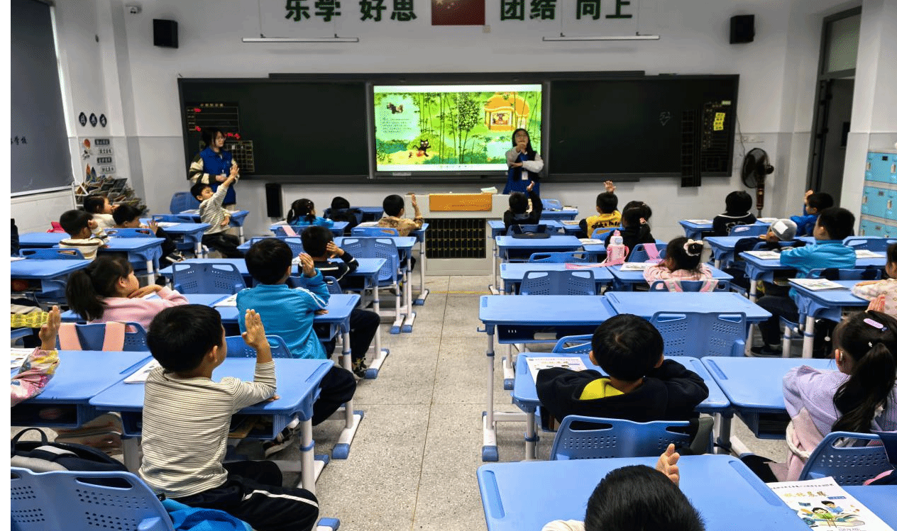 本次活动,志愿者们分为四个小组,分别四个一年级班级,以电子绘本《十二生肖的故事》为媒介,用活泼的讲述、生动的表演与小朋友们展开互动巧妙融合互动问答与角色模仿,深深吸引了孩子们的注意力。课堂中,孩子们时而凝神静听,时而踊跃举手分享自己了解的生肖知识,现场气氛温馨而热烈。