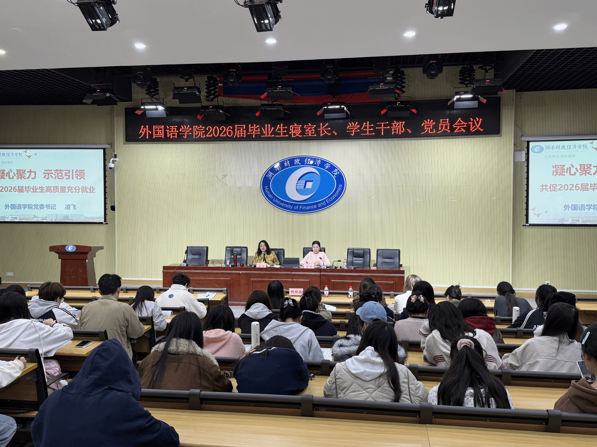 (本网讯)为统筹推进 2026 届毕业生就业工作,充分发挥寝室长、学生干部及学生党员的先锋模范作用,凝聚就业工作合力,2025 年 11 月 13 日下午 4:30,外国语学院在第二教学楼新阶梯教室 2J03 召开专题会议。学院党委书记凌飞、副书记张鹏、学工办主任肖叶枝、辅导员杨舒淇、胡文志及毕业班寝室长、学生干部、学生党员代表共计 150 余人参会。