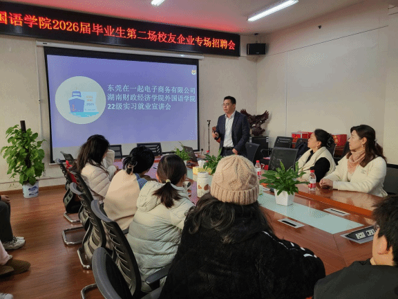 (本网讯)12月18日下午,外国语学院2026届毕业生第二场校友企业专场招聘会在学院会议室顺利举行。本次招聘会邀请了东莞在一起电子商务有限公司、良师教育集团等优质企业回校“招贤纳士”,旨在为毕业生搭建与企业直接对接的桥梁,促进毕业生高质量就业。学院党委书记凌飞、党委副书记张鹏、学工办主任肖叶枝及毕业班辅导员杨舒淇、胡文志出席活动,近50名2026届毕业生参与求职应聘。