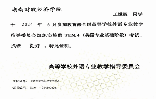 进入大学以来,我始终保持着对学习的热情,这种热情无关课程是否擅长、是否喜欢,只要开启学习,我便认真对待,力求做到最好。这种执着,让我在学业上全力以赴。专业课如口译基础、英汉笔译、英美文学史等,成绩均在90分以上,无一挂科。2023 - 2024学年,我以91.73分的专业成绩和93.38分的综合测评成绩,位列专业第一。凭借着这份优异的成绩,我连续两年获得校级奖学金,还荣获了国家励志奖学金“三好学生”荣誉称号