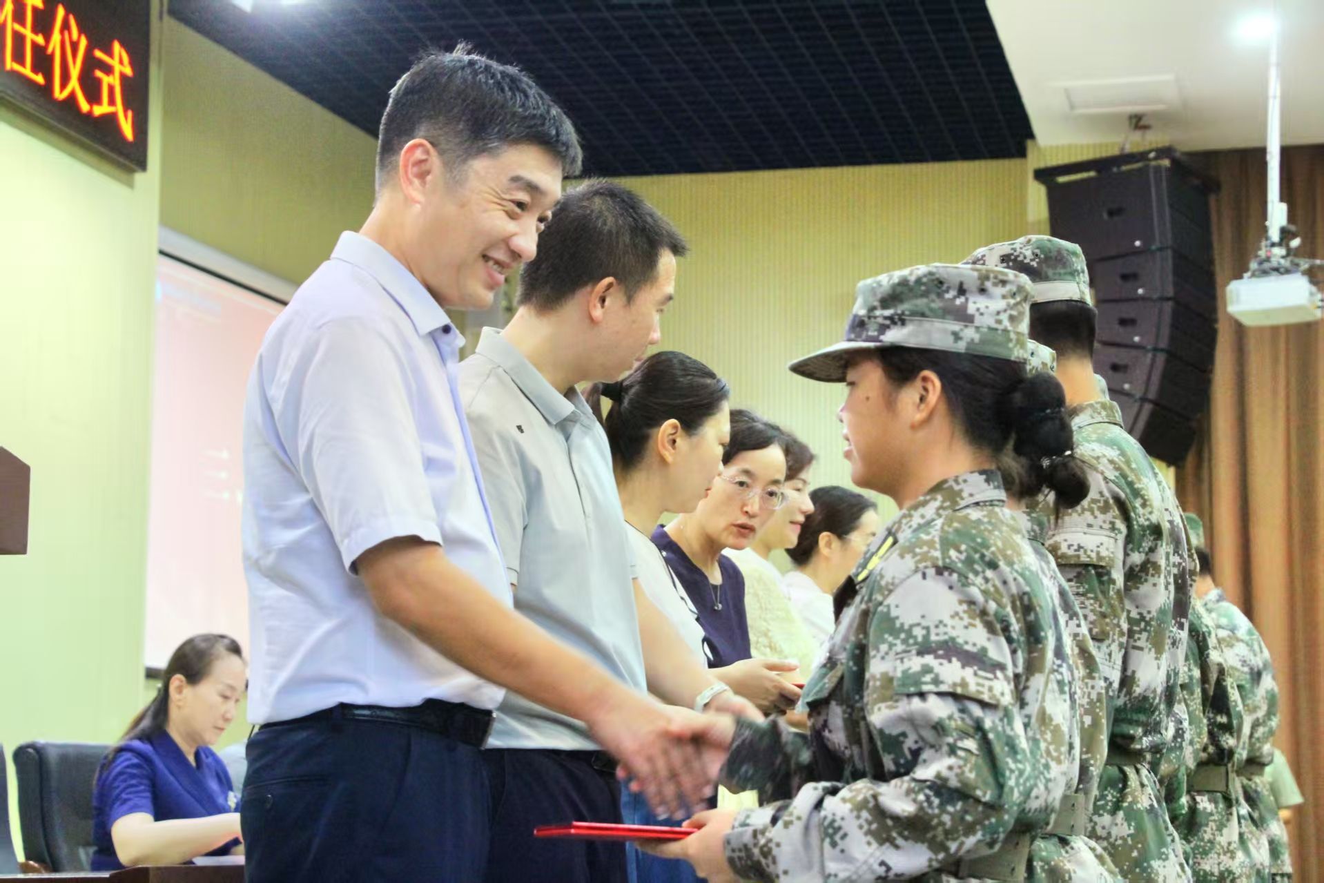 在全体队员齐声高唱国歌后,仪式正式开始。学生工作部部长欧阳海峰宣读了2025级新生军训教官聘任文件,来自各二级学院的90名在校生被正式聘任为2025级新生军训教官。各二级学院学工负责人为受聘教官颁发聘书。