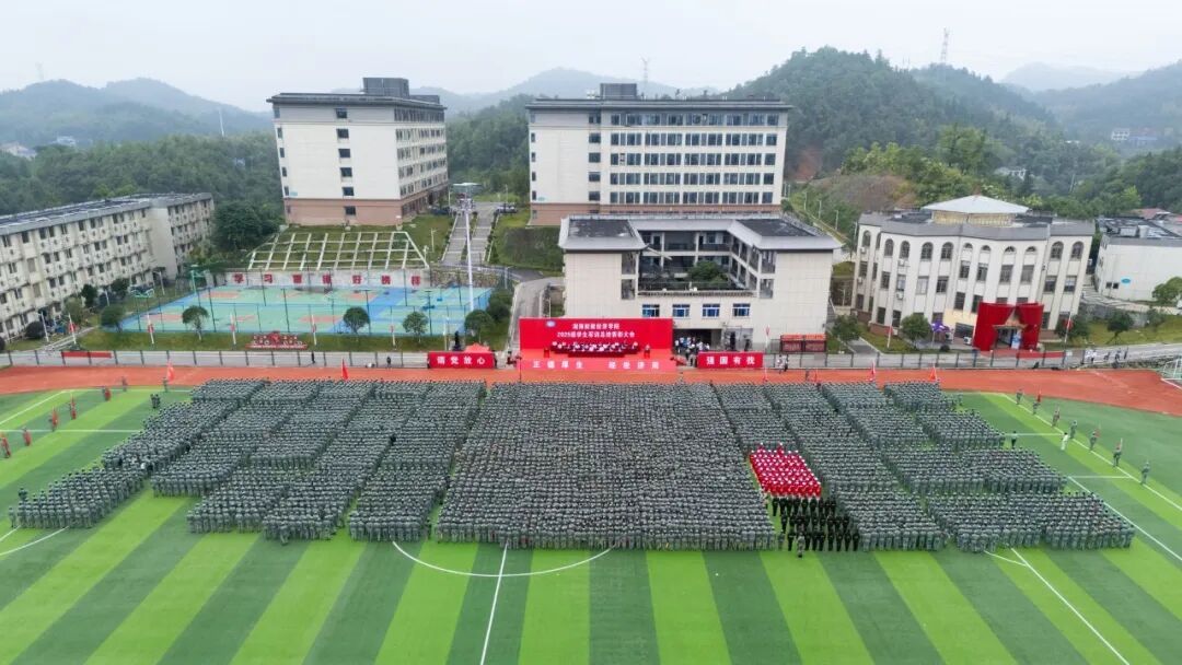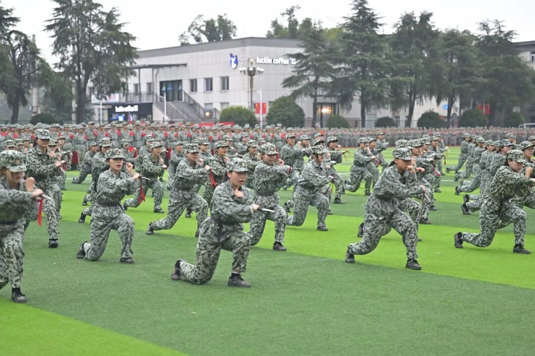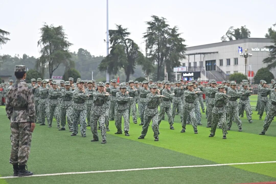 历经14天骄阳与风雨的洗礼,2025级学子完成了从青涩到坚韧的蜕变。军事训练成果汇报表演中,31支分列式方阵步伐铿锵、口号嘹亮,依次正步通过主席台,展现昂扬风貌;擒敌拳方阵招式凌厉、气势如虹,匕首操、刺杀操方阵在战鼓声中迅猛出击,杀声震耳;2050名学生组成的文化方阵先后呈现出“雷锋”“正德厚生 经世济用”“我❤中国”“1933-2025”等图案与字样,齐声宣誓“请党放心,强国有我”,滚烫的誓言彰显着新时代青年的责任与担当。