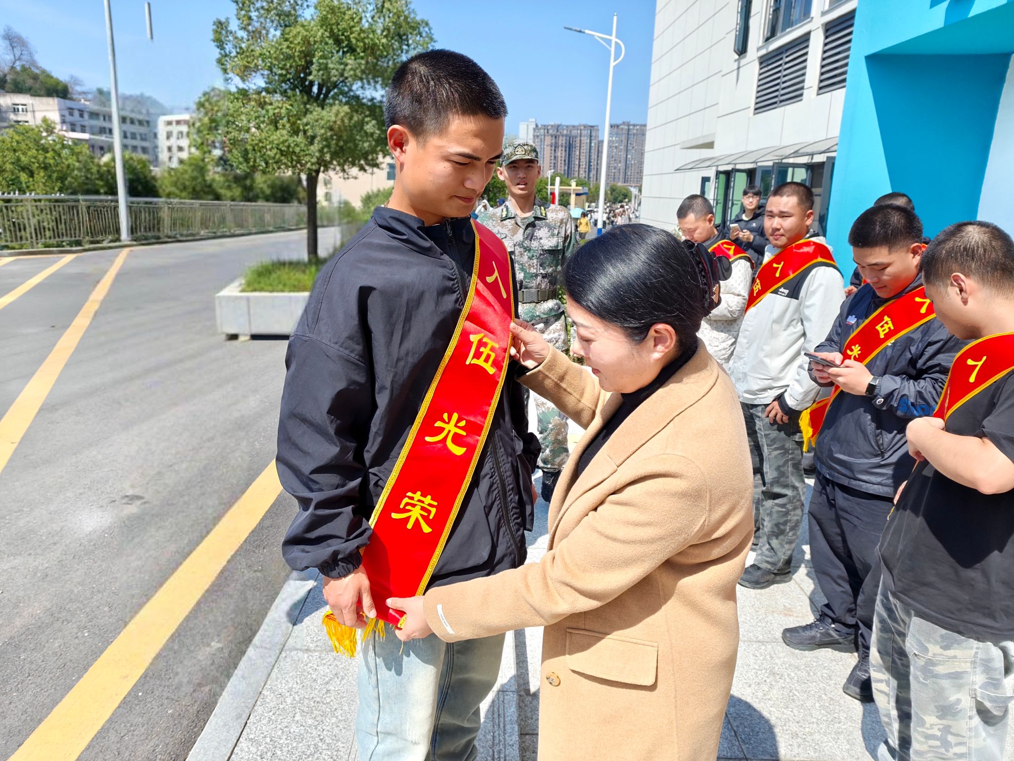 李六华为每位新兵佩戴上光荣的绶带,送上寓意深远的纪念品,并代表学校致以殷切嘱托。她寄语新兵们:一要快速完成角色转变,积极适应军营生活;二要立志建功军营,苦练胜战本领,将青春热血融入强国强军伟业;三要永怀母校培育之恩,牢记师长期望,以优异成绩为家乡和母校增光添彩。