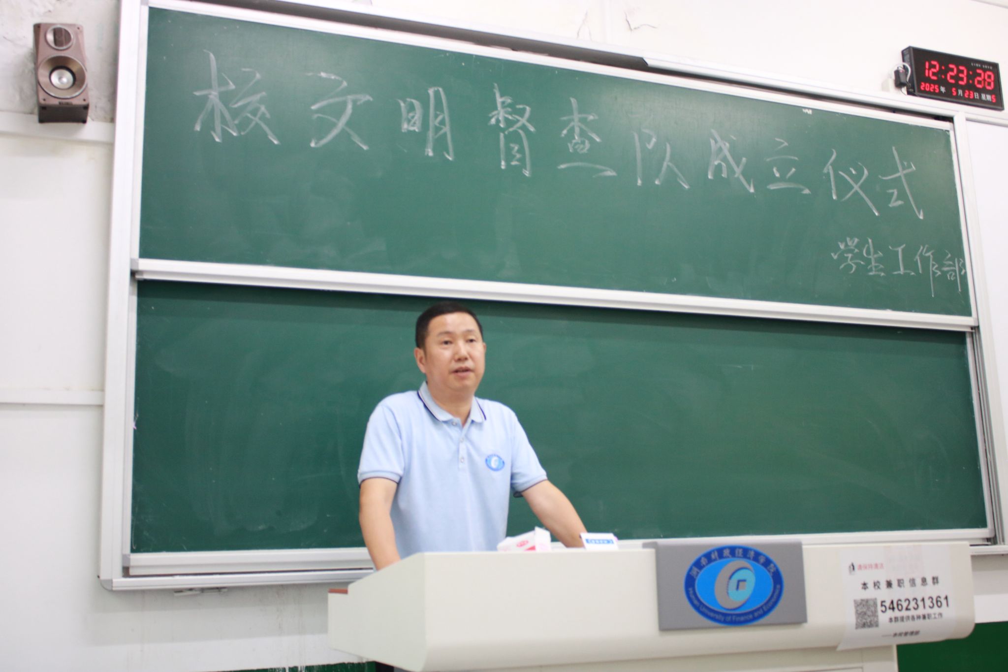 学生工作部部长欧阳海峰在讲话中提出殷切期望:第一,要提高思想认识,强化责任担当。“天下兴亡,匹夫有责”,你们是校园文明的守护者和传播者,每一次督查都是对校园文明的捍卫,每一次劝导都是对文明理念的传递。希望大家时刻牢记自己的使命,以高度的责任感和使命感投入到督查工作中,不敷衍、不懈怠,真正做到守土有责、守土尽责。第二,要坚持公平公正,讲究工作方法。在督查过程中,难免会遇到熟人或朋友,大家一定要秉持公平公正的原则,不偏袒、不包庇对所有不文明行为一视同仁。正如《论语》中所说:“其身正,不令而行;其身不正,虽令不从。”同时,也要注意工作方式方法,文明督查、礼貌劝导,避免简单粗暴,用真诚和耐心去说服他人,让被督查者心服口服,真正认识到自己的问题并加以改正。第三,要以身作则,做好表率。“桃李不言,下自成蹊”,督查队成员的一言一行都备受同学们关注,你们的文明举止就是最生动的教材。希望大家在日常生活中严格要求自己,从自身做起,从小事做起,自觉遵守校规校纪,践行文明行为规范,用自己的实际行动为同学们树立榜样,引领校园文明新风尚。第四,要加强团队协作,凝聚工作合力。“单丝不成线,独木不成林”,督查队是一个整体,每一位成员都是团队中不可或缺的一部分。在工作中,大家要相互支持、相互配合,遇到问题及时沟通交流,共同探讨解决方案。通过团队的力量,形成强大的督查合力,提高工作效率和质量。最后,欧阳海峰部长祝愿学生校园文明督查队在今后的工作中取得优异的成绩!祝愿每一位督查队成员在服务他人、奉献校园的过程中,收获成长与快乐。